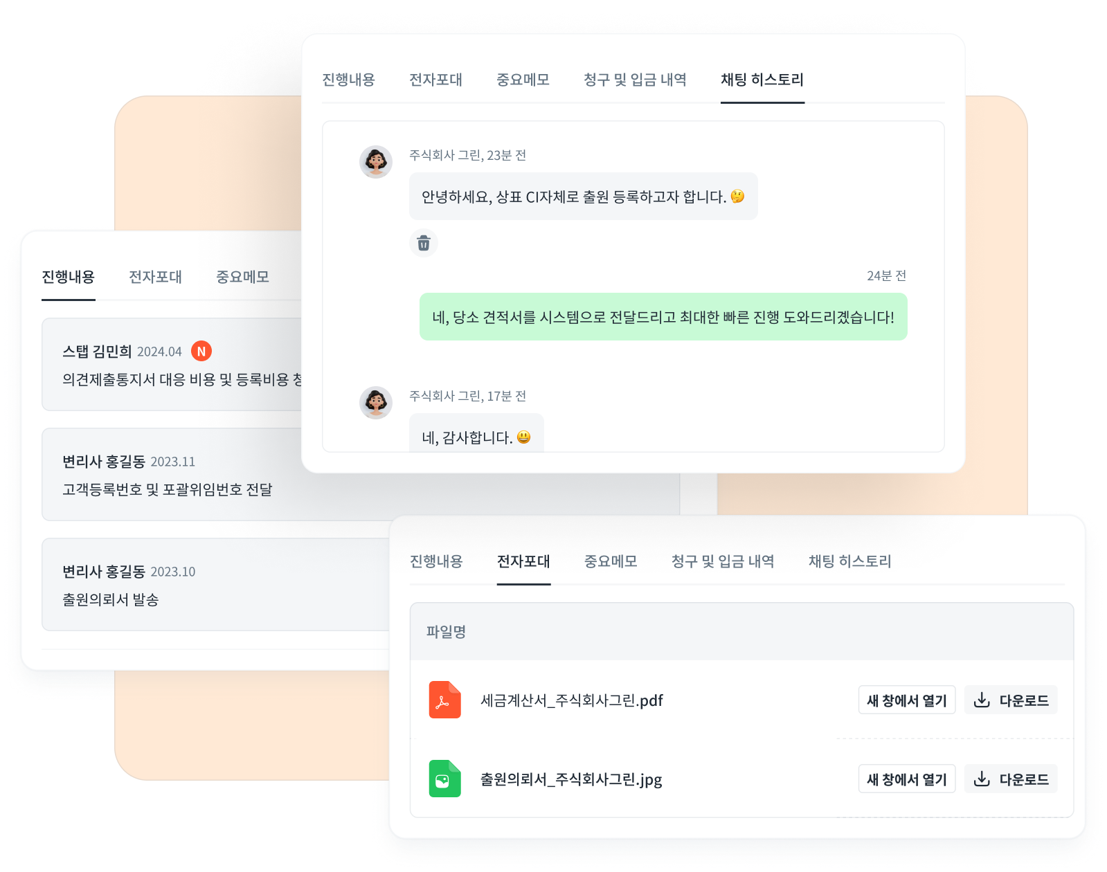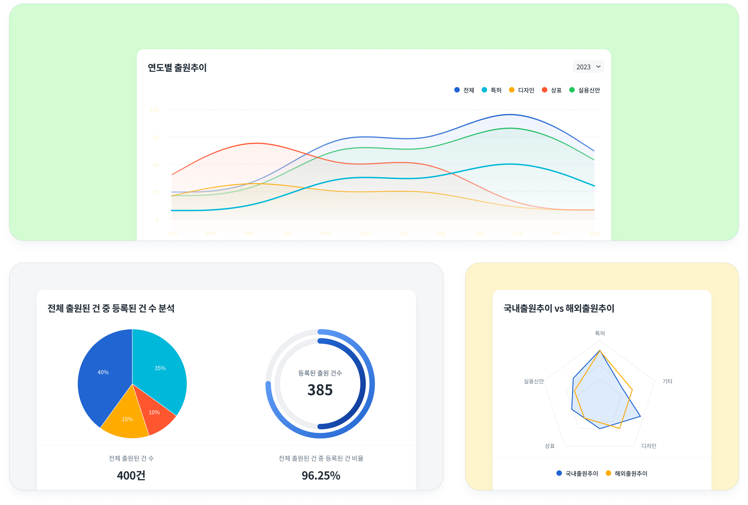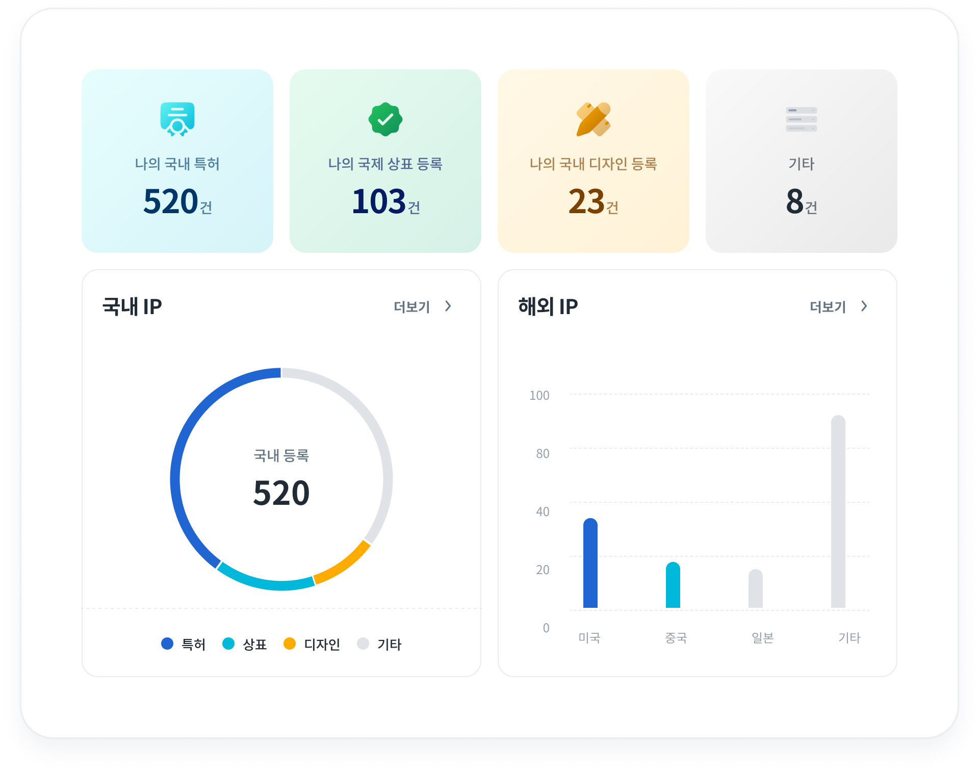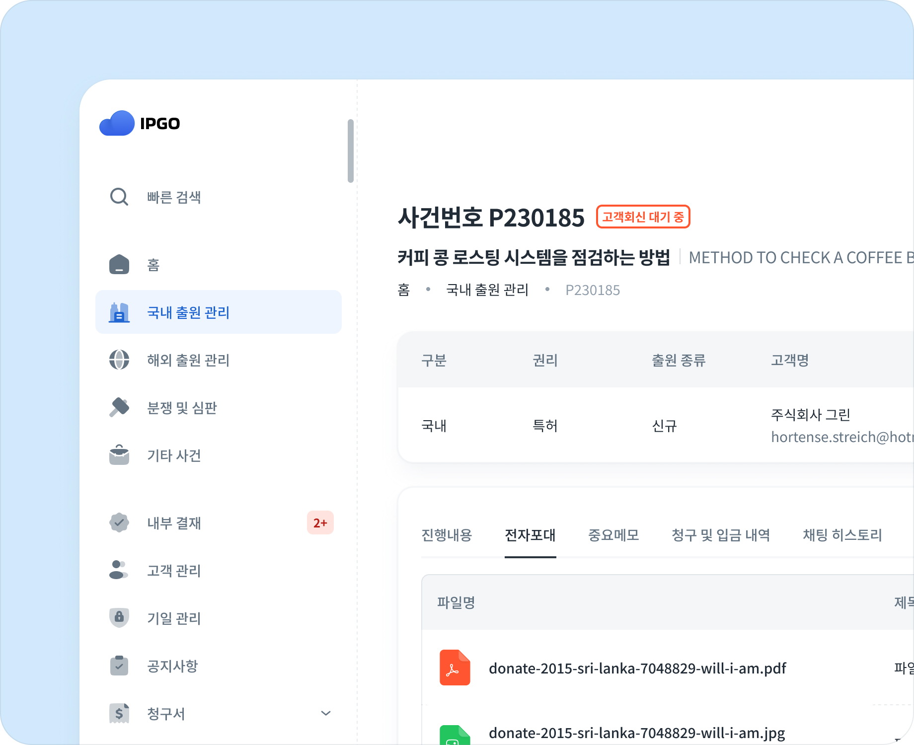 지식재산 관리 및 거래의 모든 것,아이피고(IPGO)에서 쉽고 빠르게 지금 무료로 시작하기 문의하기 지식재산 관리 우리 회사의 모든 지식재산을한 번에 관리하세요 전문가마다 운영 방식이 달라서 불편했던 지식재산 관리, 아이피고에서 모든 지식재산을 쉽게 관리하세요. 국내 출원 사건분쟁 및 심판해외 출원 사건기타 사건 히스토리 관리 사건 별 모든 진행 과정을한 눈에 확인하세요 불편하기만 했던 사건 관련 소통 및 문의사항, 단 한번의 고객 정보 입력으로 파일 관리부터 대화 내역까지 체계적으로 확인하세요. 지식재산 분석 기업 성장과 직결되는 재산 현황을 스마트하게 확인하세요 출원 상담부터 등록 과정은 물론, 업데이트 알림까지! 우리 회사의 성장 추이를 실시간으로 확인하세요. IP 관리 우리 회사의 지식 재산 현황, 체계적으로 확인하세요 불편하기만 했던 우리 회사의 지식재산 관리, 아이피고에서 모든 사건을 한 번에 관리하세요. 우리 회사의 모든 지식재산 관리,무료로 시작해보세요 지금 무료로 시작하기